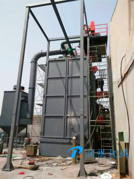 本機(jī)工作時(shí),當(dāng)準(zhǔn)備工作(除塵系統(tǒng)、分離器提升機(jī)、螺旋輸送器等運(yùn)行)完畢后,機(jī)器開(kāi)始正常工作。首先,電動(dòng)葫蘆在室體外裝上工件后吊起,將工件開(kāi)進(jìn)清理室,當(dāng)?shù)竭_(dá)拋丸工位時(shí),大門開(kāi)始關(guān)閉,工件開(kāi)始自轉(zhuǎn),此時(shí)打開(kāi)拋丸器,開(kāi)供丸閘,開(kāi)始對(duì)工件進(jìn)行拋丸清理,清理一段時(shí)間后,關(guān)閉供丸閘門,關(guān)閉拋丸器,關(guān)閉除塵系統(tǒng),打開(kāi)大門,工件吊出室體卸件。重復(fù)上述過(guò)程直至工作完畢,按順序停機(jī)。